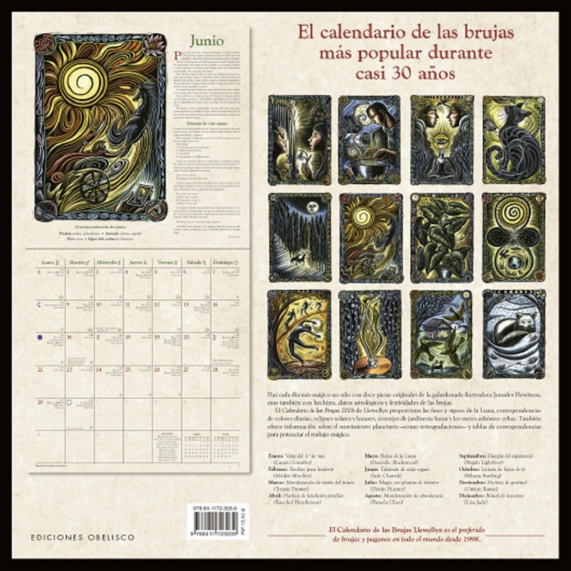 El Calendario de las Brujas 2026 de Llewellyn proporciona las fases y signos de la Luna, correspondencias de colores diarias, eclipses solares y lunares, consejos de jardinería lunar y los meses arbóreos celtas. También ofrece información sobre el movimiento planetario -como retrogradaciones- y tablas de correspondencias para potenciar el trabajo mágico.