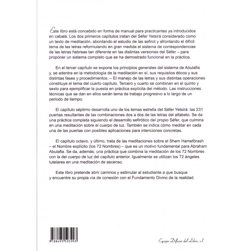 Este libro está concebido en forma de manual para practicantes ya introducidos en cabalá. Los dos primeros capítulos tratan del Séfer Yetsirá considerado como un texto de meditación, abordando el estudio de las sefirot y afrontando el difícil tema de las letras reformulando en gran medida el sistema de correspondencias de las letras hebreas tan diferente en las distintas versiones del Séfer – para proponer un sistema completo que se ha demostrado funcional en la práctica. En el tercer capítulo se expone los principios generales del sistema de Abulafia y, se adentra en la metodología de la meditación en sí, sus requisitos éticos y sus distintas fases y procedimientos. – El manejo de las letras y sus distintas operaciones constituye el tema del cuarto capítulo. Tercero y cuarto se combinan en el quinto y sexto para ejemplificar la puesta en práctica explícita del método. Las instrucciones técnicas que se dan en ellos serán tema de trabajo progresivo a lo largo de un periodo de tiempo. El capítulo séptimo desarrolla uno de los temas estrella del Séfer Yetsirá: las 231 puertas resultantes de las combinaciones dos a dos de las letras del alfabeto. Se da una práctica completa siguiendo el desarrollo sefirótico del propio Séfer, que culmina en una meditación sobre el cuerpo de luz. También se indica cómo meditar en cada una de las puertas con posibles aplicaciones para intenciones concretas. El capítulo octavo, y último, trata de las meditaciones sobre el Shem Hamefórash – el Nombre explícito (los 72 Nombres) – que es un motivo fundamental para Abraham Abulafia. Se da, además, una práctica que combina la meditación de los 72 Nombres con la del cuerpo de luz del capítulo anterior. Igualmente se utilizan los 72 ángeles tutelares en una meditación de ascenso. Este libro pretende abrir caminos y estimular al estudiante a que busque y encuentre su propia vía de conexión con el Fundamento Divino de la realidad.